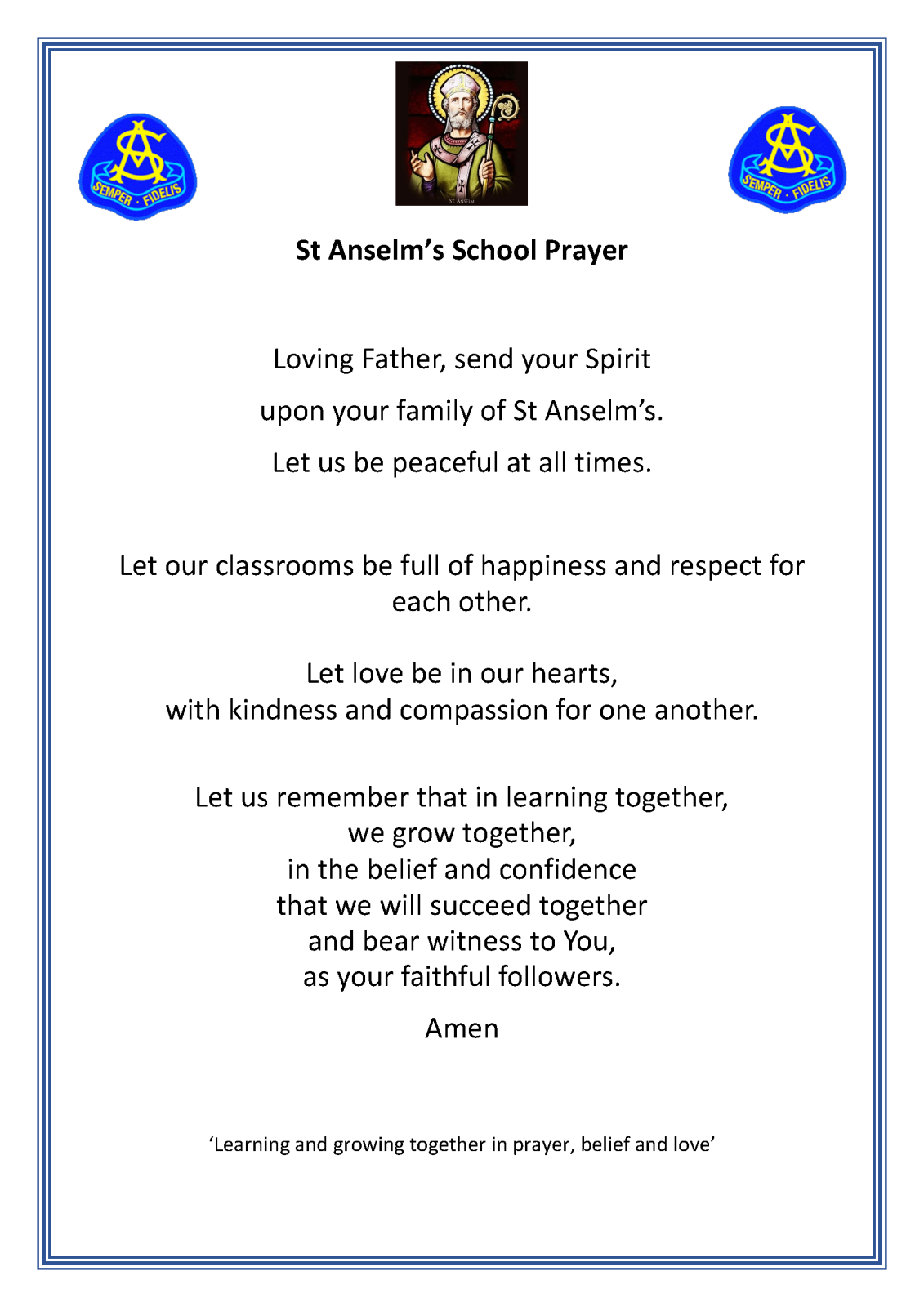 We say our St Anselm's prayer together each and every day, during whole school Liturgy and Prayer through Song time.